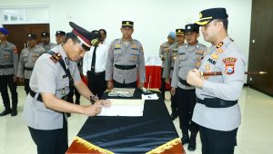 Prosesi sertijab ditandai dengan pengambilan sumpah jabatan serta penandatanganan berita acara oleh pejabat baru di hadapan Kapolres Gresik.